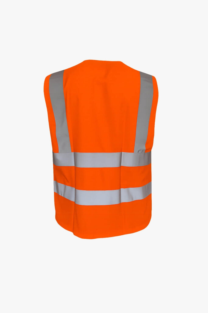 Chaleco de alta visibilidad en color naranja, ligero y resistente, ideal para seguridad industrial y trabajos en exteriores.